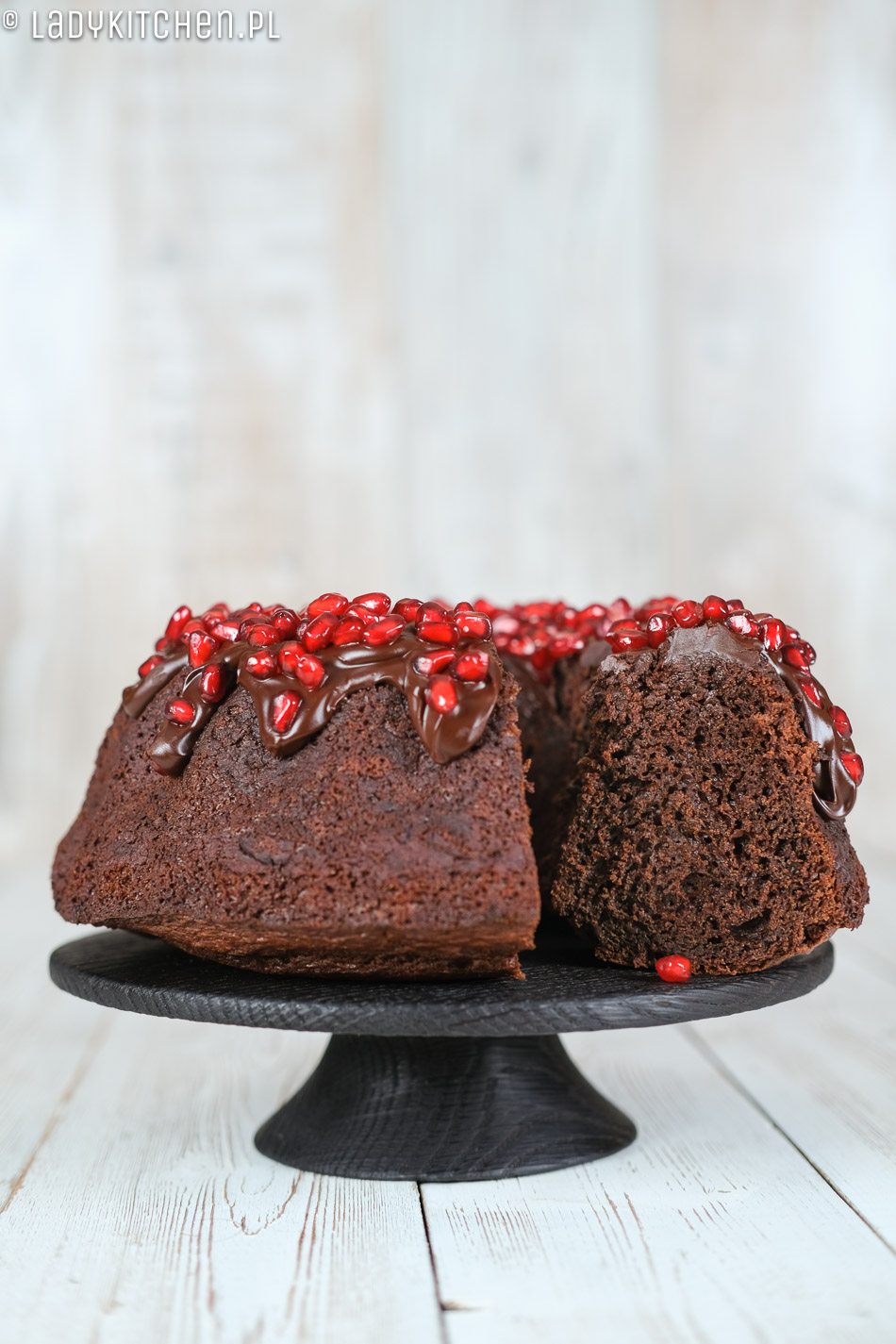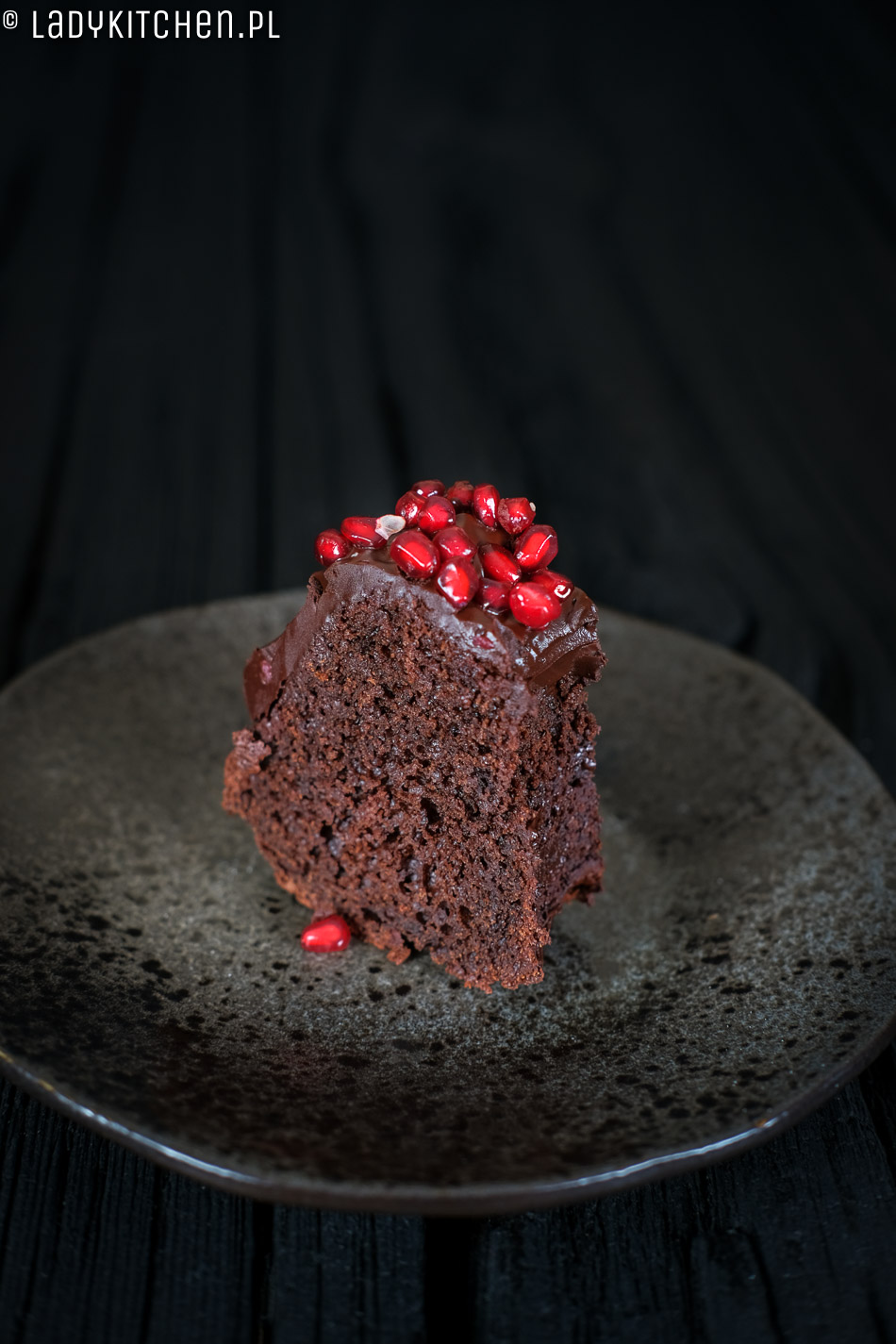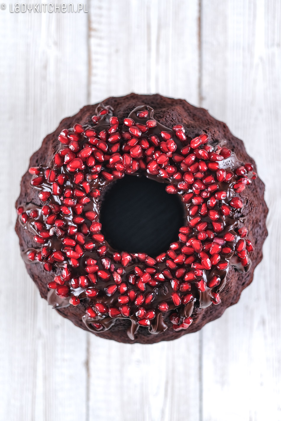 6. Wystudzone ciasto smarujemy rozpuszczoną z masłem czekoladą i dekorujemy owocami. Polecam pestki granatu, są przyjemnie kwaskowate, pięknie wyglądają.