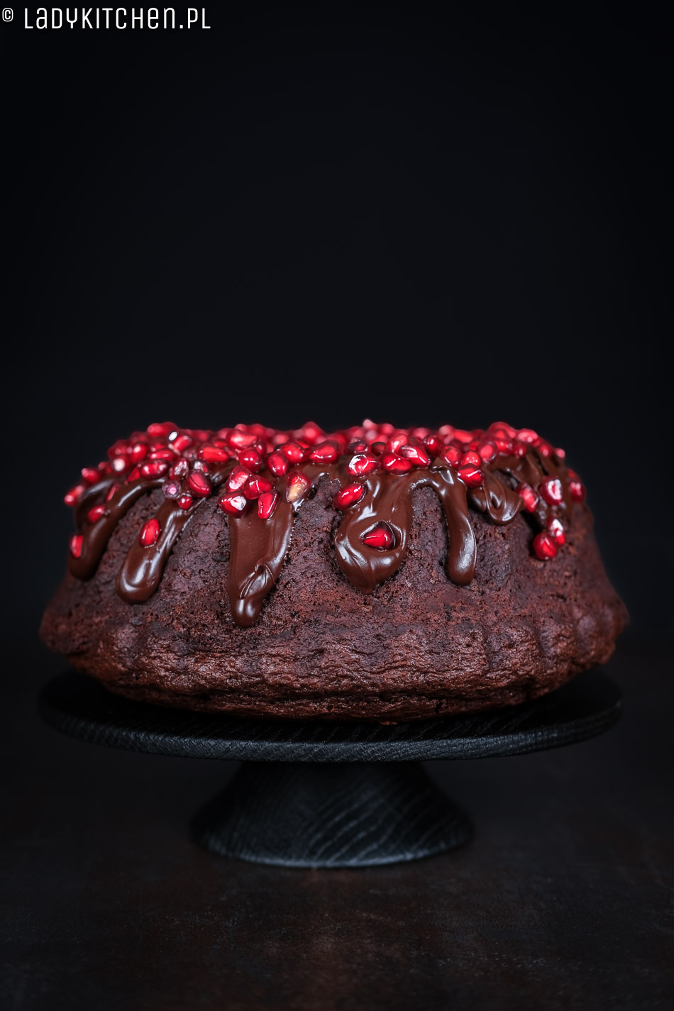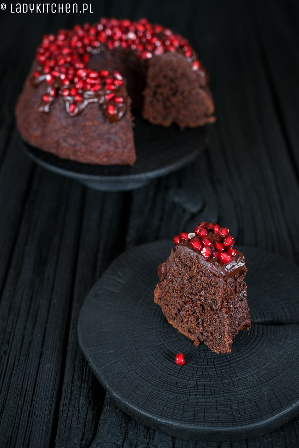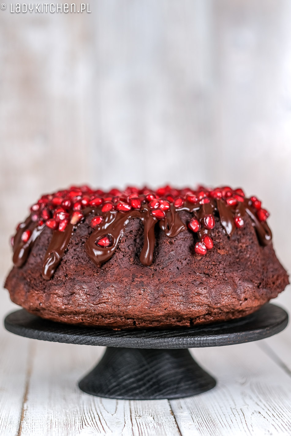 6. Wystudzone ciasto smarujemy rozpuszczoną z masłem czekoladą i dekorujemy owocami. Polecam pestki granatu, są przyjemnie kwaskowate, pięknie wyglądają.