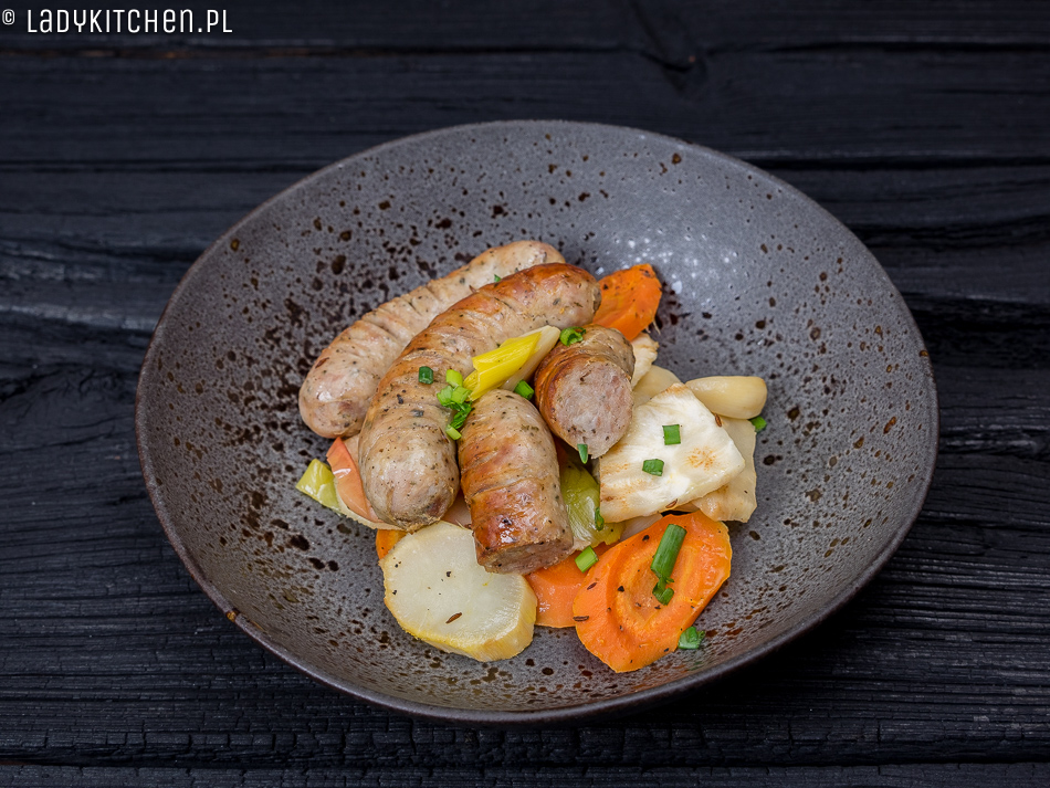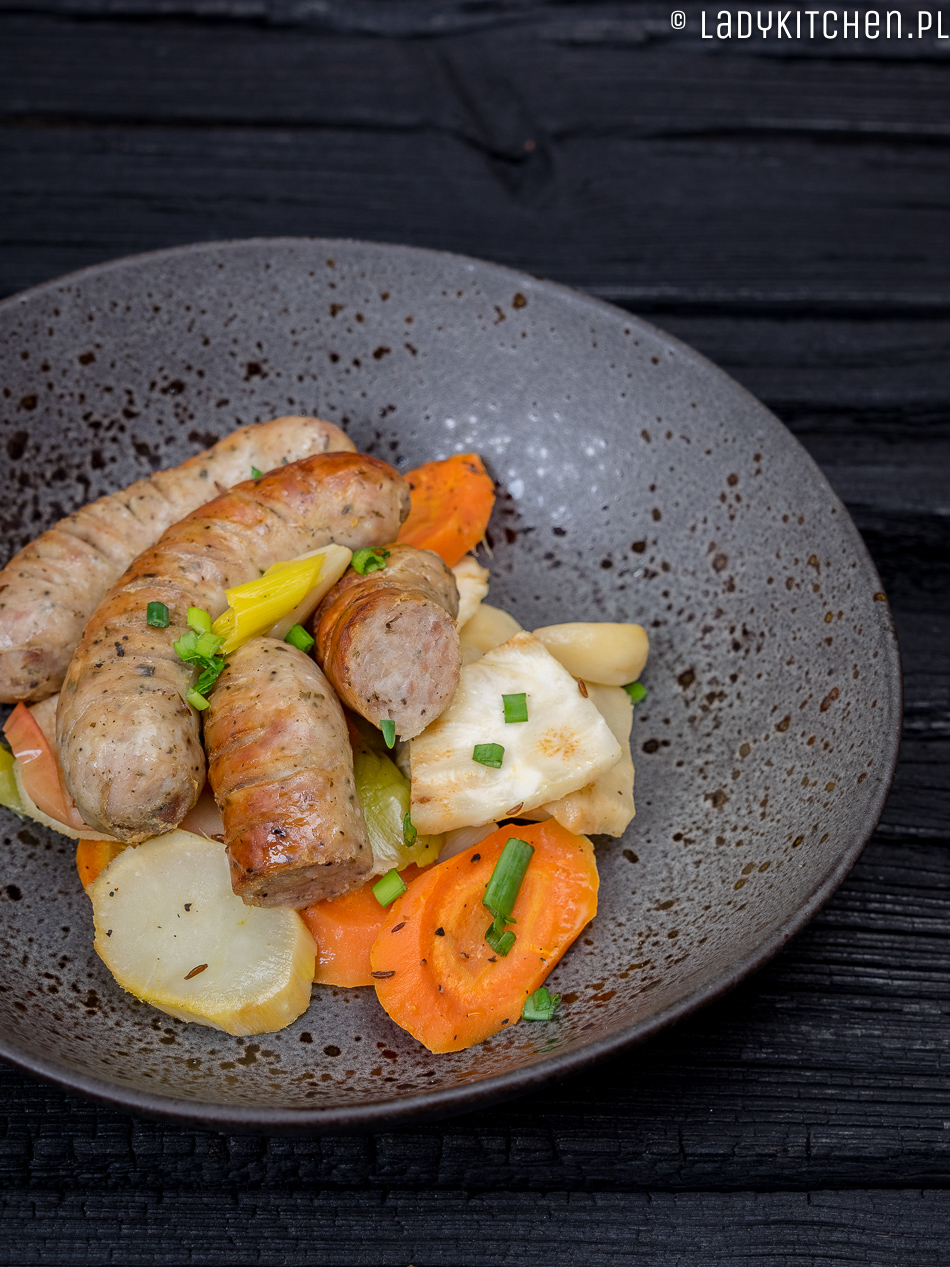 Prościej się nie da – warzywa obieramy i kroimy na podobnej wielkości kawałki. W misce łączymy olej, majeranek, sok z cytryny i pokrojone drobno ząbki czosnku. Dokładnie obtaczamy w tym warzywa. Warzywa układamy na blasze do pieczenia lub w naczyniu żaroodpornym. Na tym układamy ponacinaną białą kiełbasę. Jabłko pozbawiamy gniazda nasiennego, kroimy na ósemki i układamy między kiełbasą. Podlewamy sokiem lub cydrem. Przykrywamy folią aluminiową bądź pokrywką. Wsadzamy do nagrzanego do 200 stopni piekarnika. Pieczemy około 30 min. Po tym czasie ściągamy przykrycie i pieczemy jeszcze 10 min, żeby kiełbasa się przyrumieniła.