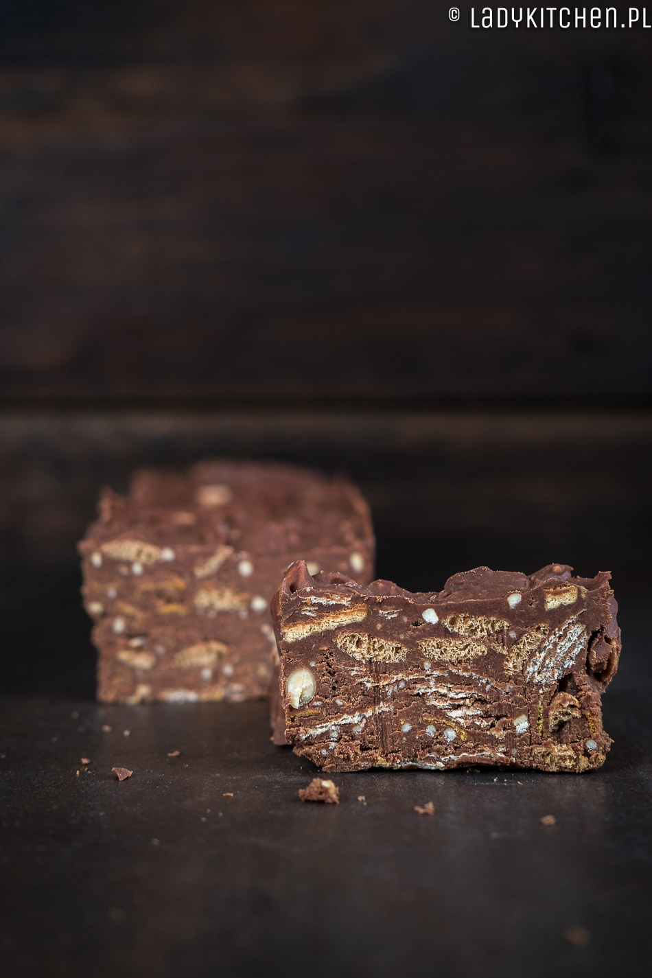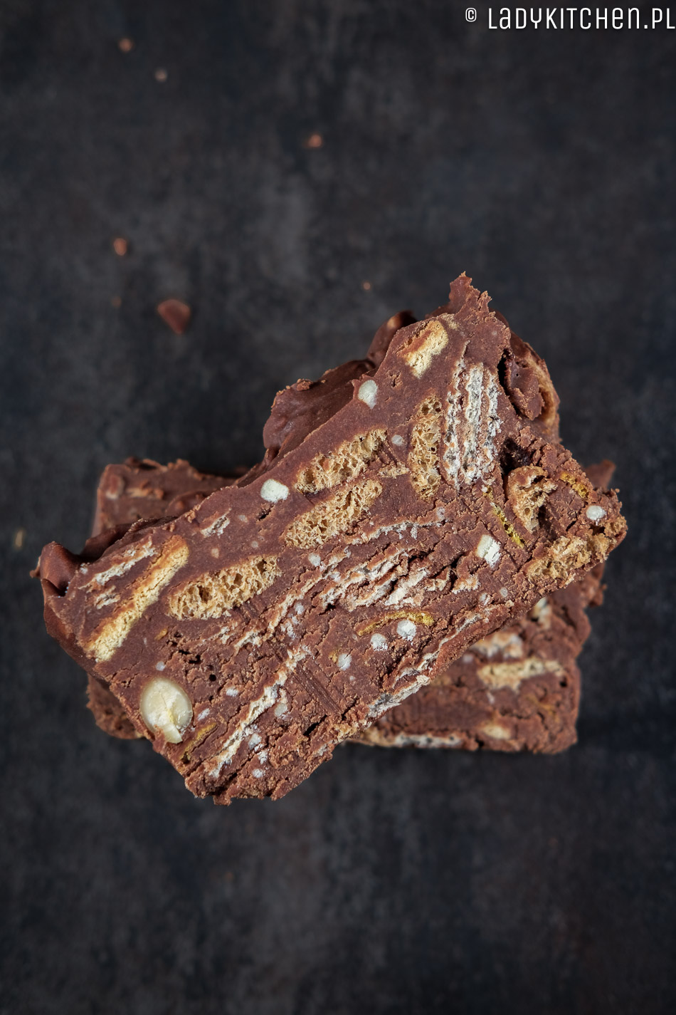 Siedząc przy porannej kawie, rozmawiałam z mamą o deserach z jej dzieciństwa i o tym, jak ciężko było wykombinować coś fajnego, podczas gdy w sklepach nie było nic. Pomyślałam wtedy, że może czas dorosnąć i zrobić blok czekoladowy? Trochę pokombinować i może odczarujemy trochę smak ohydnej margaryny? Pierwsza próba była taka se, bo się trzymałam zaleceń i dałam orzechy i wafle. Zasięgnęłam konsultacji u starszyzny rodu, która orzekła, że blok czekoladowy to była bardzo biedna krewna marzeń o czekoladzie i jak ktoś sobie życzy spożywać czekoladę z kabanosem, to blok czekoladowy też może być z kabanosem. Najważniejsza jest masa, a dodatki są dowolne. Więc mój blok czekoladowy to wersja „czyszczę spiżarkę”. Użyjcie masła i dobrej jakości kakao, a wyjdzie naprawdę fajny deser, który je się z przyjemnością.