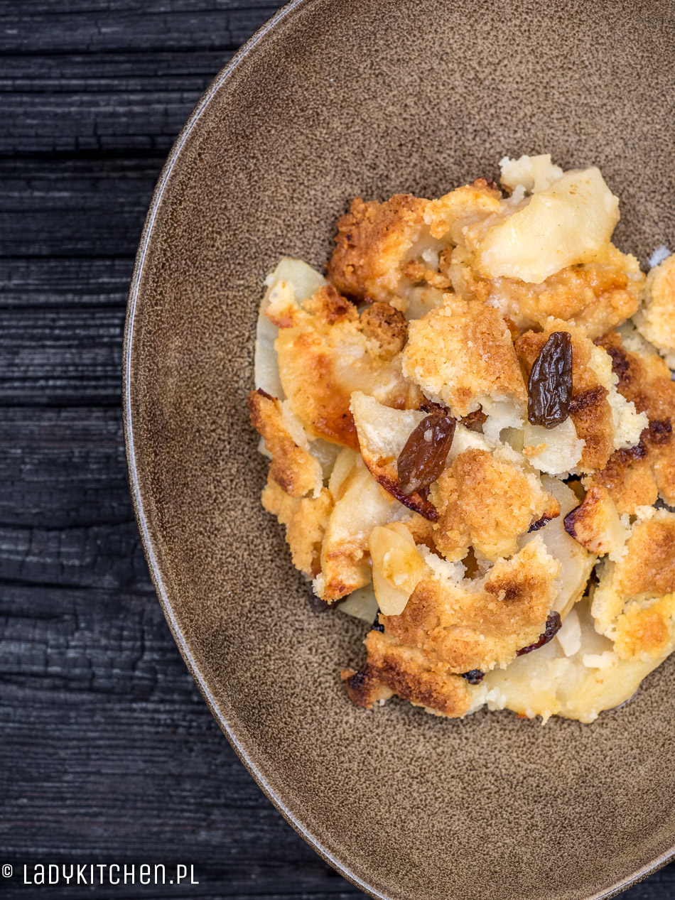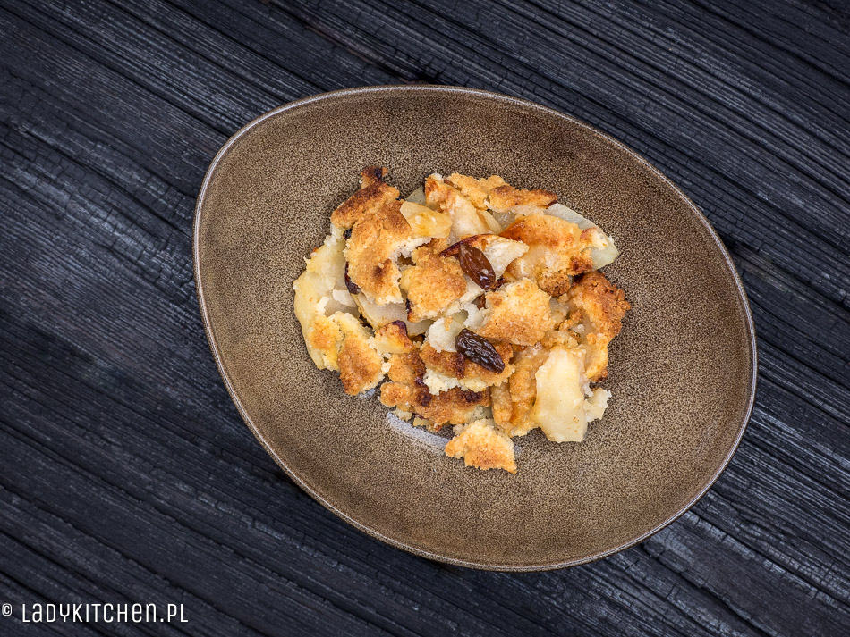 Owoce pod kruszonką, to jedyna rzecz, która pomaga przetrwać dzień z cyklu: „świat jest okrutnym miejscem i należy go zaorać, podpalić i zalać gaszonym wapnem”. Jeśli coś pachnie masłem, orzechami i karmelem, musi to być miłość i nie można tego posłać do diabła, należy to oblizać, powąchać i zjeść. Jeśli wstajecie w niedzielny poranek, a oknem leje lub – co gorsza – pada taka obleśna mżawka, która wwierca się wszędzie, to czas wyciągnąć broń ostateczną – masło! Bądźcie sprytni i przygotujcie sobie kruszonkę na zapas, w szczelnie zamkniętym pojemniczku, w zamrażarce, wytrzyma dwa tygodnie. Od razu mówię, że nie ma czegoś takiego, jak „za dużo kruszonki”. Kruszonki zawsze jest za mało.