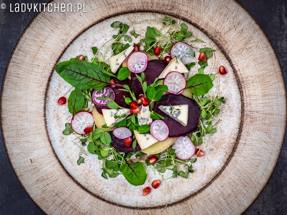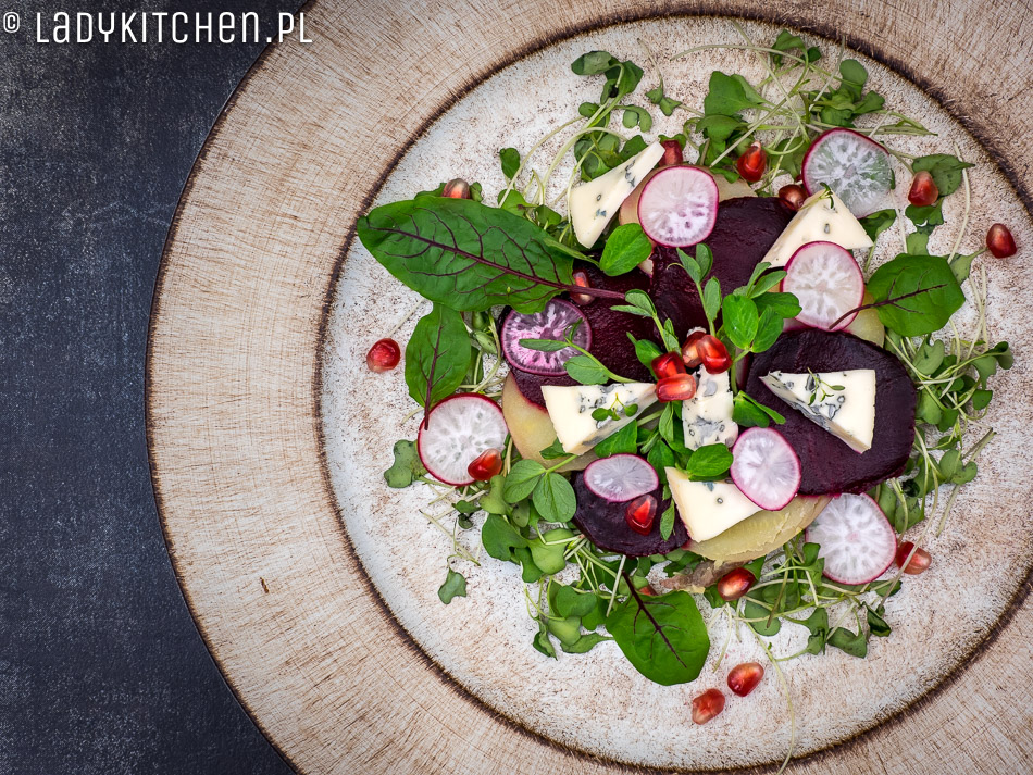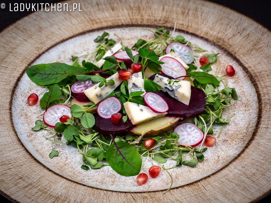 Jakiś czas temu pokochałam buraki pieczone, są dużo słodsze niż gotowane, mają więcej smaku i potrafią przekonać każdego, burakowego niejadka. Rzodkiewkę możecie zastąpić jabłkiem, znam takich, co na dźwięk słowa „rzodkiewka” dostają spazmów. Zamiast pieczonego ziemniaka, możecie dać seler, pietruszkę lub gruszkę. Bawcie się smakami, kombinujcie, zmieniajcie sałaty, dodawajcie składniki wasze ulubione. Niech pieczony burak i ser pleśniowy będą centrum kulinarnego wszechświata, a wkoło niech krąży wasza wyobraźnia. Kto wie, może stworzycie dzieło życia, które wejdzie do klasyki kanonu kulinarnego? Przecież wszystko zaczyna się od eksperymentów.
